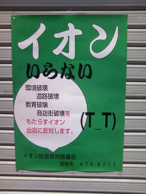 近所(といっても車で行く距離ですが)にイオンが出来る計画があるそうなのですが、地元の商店街が猛反対。