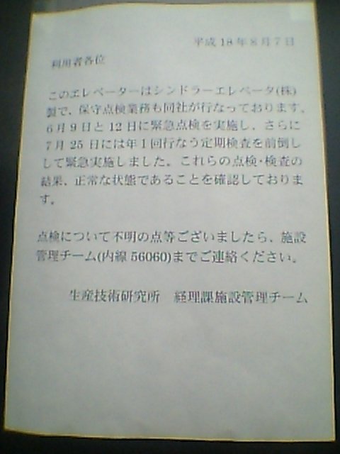 事件以降に、シンドラー社のエレベータに乗ったのは初めてかもしれません(笑)