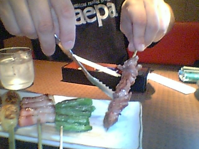 そういえば、串焼きを頼むと、女性の方が串を咥えづらいだろうということで、こんなフォークのようなものが付いてきます。